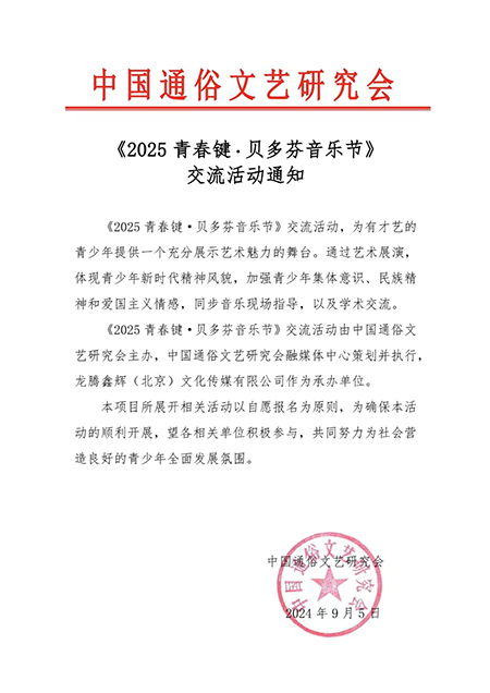 《2025 青春键·贝多芬音乐节》交流活动由中国通俗文艺研究会主办,中国通俗文艺研究会融媒体中心策划并执行,龙腾鑫辉(北京)文化传媒有限公司作为承办单位。 本项目所展开相关活动以自愿报名为原则,为确保本活动的顺利开展,望各相关单位积极参与,共同努力为社会营造良好的青少年全面发展氛围。